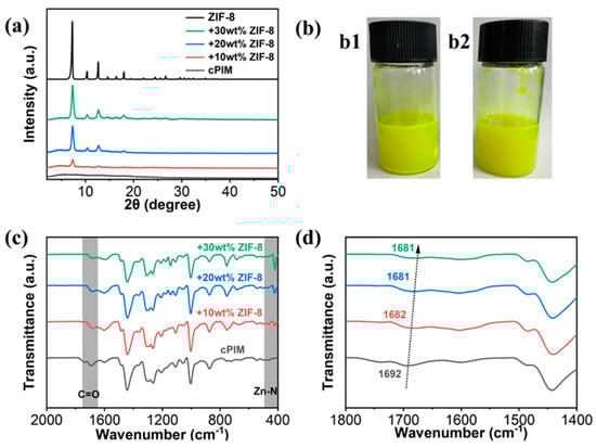 The XRD patterns shown in Figure 2a and Figure S4a demonstrate that the ZIF-8 retained its structural integrity after its incorporation into the PIM-1 and cPIM matrix and that the diffraction intensity was enhanced with the increase in the loading content of the ZIF-8 particles [28]. Furthermore, it was observed that the characteristic peak of ZIF-8 at ap-proximately 7.20 in the ZIF-8/cPIM membranes was shifted to a higher angle. However, this phenomenon was not observed in the ZIF-8/PIM-1 membranes. This suggests that the augmented rigidity of the ZIF-8 cell may be attributed to the interaction between the carboxyl group in cPIM and the Zn sites in the ZIF-8 framework [37]. The optical images shown in Figure 2b are of two casting solutions that ere left to stand for 24 h, in which b1 and b2 correspond to the ZIF-8/PIM-1 and ZIF-8/cPIM casting solutions, respectively. It was observed that some ZIF-8 particles precipitated in the ZIF-8/PIM-1 casting solution, while the ZIF-8/cPIM solution remained homogeneous. This suggests that the carboxyl groups in cPIM can promote the dispersion of ZIF-8 within the polymer, thereby enabling the preparation of uniformly dispersed high-loading MMMs [23].