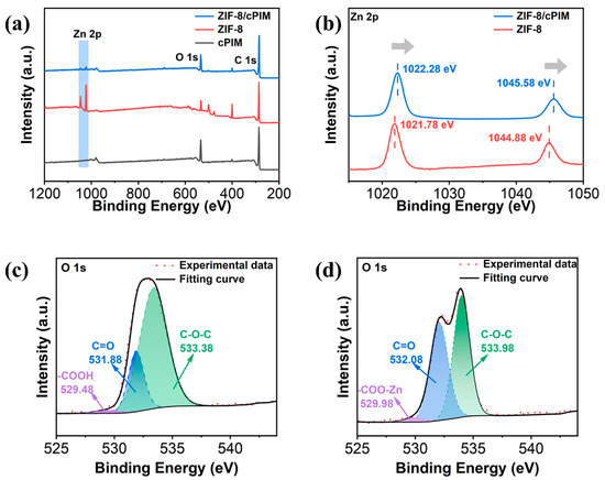 XPS spectra of ZIF-8, cPIM, and 20 wt% ZIF-8/cPIM. (a) Wide-scan XPS spectrum. (b) High-resolution XPS spectra of Zn 2p in both ZIF-8 and ZIF-8/cPIM. High-resolution XPS spectra of O 1s for cPIM (c) and ZIF-8/cPIM (d).