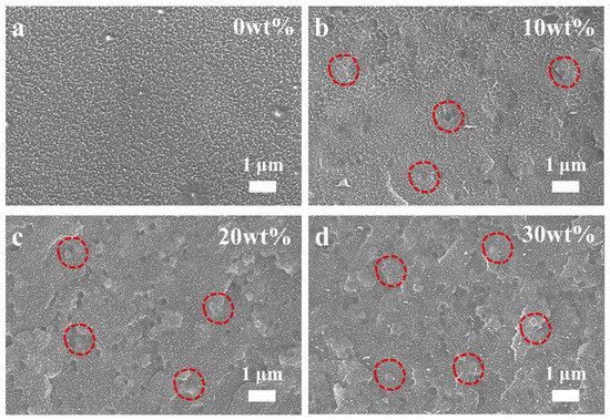 In order to verify the superiority of cPIM in the preparation of MMMs, a series of MMMs was prepared by blending ZIF-8 with PIM-1 and cPIM, respectively. Optical images of the ZIF-8/cPIM membranes are shown in Figure S5, where it can be seen that ZIF-8 exhibited good membrane-forming properties in cPIM matrices when the loading range of ZIF-8 was 10–30 wt%; however, a film fragmentation phenomenon occurred when the loading was increased up to 40 wt%. Therefore, the subsequent discussion is based on the MMMs within the filler loading range of 10–30 wt%. Cross-sectional SEM images were used to determine the dispersion of ZIF-8 in the polymer matrix. The SEM images of the ZIF-8/cPIM MMMs show that the MOF filler was uniformly dispersed in the cPIM matrix at loadings in the range of 10–30 wt% and in an encapsulated polymer state, in which it appeared to be encapsulated by the polymer, with no agglomeration or precipitation observed (Figure 4). However, SEM images of the ZIF-8/PIM-1 membranes (Figure S6) show that ZIF-8 was well dispersed when its loading was in the range of 10–20 wt%; ZIF-8 agglomerated within the membranes when the ZIF-8 loading reached 30 wt%, resulting in the formation of non-selective defects, and was not conducive to the enhancement of gas selectivity [17,23,24,39].