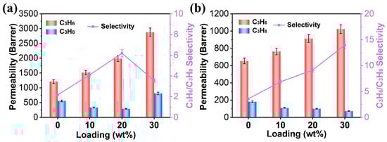 To determine the superiority of the cPIM over PIM-1 matrices, the separation performance of MMMs with 10–30 wt% ZIF-8 loadings was investigated on C3H6/C3H8 (50/50) gas mixtures (Tables S1 and S2). As shown in Figure 5a, the addition of ZIF-8 (10–20 wt%) resulted in a simultaneous increase in the C3H6 permeability and in the C3H6/C3H8 selectivity from 2 to about 6 in the ZIF-8/PIM-1 membranes. Additionally, a gradual decrease in C3H8 permeability was observed, which can be attributed to the molecular sieving effect of ZIF-8 [20,40]. However, when the loading of ZIF-8 reached up to 30 wt%, although the permeability of C3H6 continued to increase, the permeability of C3H8 also increased, resulting in a decrease in the C3H6/C3H8 selectivity to about 3.5. This is attributed to the non-selective defects caused by the aggregation of ZIF-8 within the membrane at high loading levels, which weaken the molecular sieving effect of ZIF-8. In contrast, the permeability of C3H8 continued to decrease in the case of the ZIF-8/cPIM membranes, while their C3H6 permeability and C3H6/C3H8 selectivity improved with increasing ZIF-8 loadings within the range of 10–30 wt%. In particular, when ZIF-8 was added to a 30 wt%, the C3H6 permeability was 1023 Barrer and the C3H6/C3H8 selectivity was 13.97, representing an improvement of 57% and 289%, respectively, in comparison with pristine cPIM. The excellent gas separation performance of the ZIF-8/cPIM membranes at a loading of 30 wt% is attributed to the interfacial coordination between the filler and the polymer, which enables the uniform dispersion of the filler within the polymer matrix. This allows ZIF-8 to exhibit its maximum sieving effect on C3H6/C3H8 gas separation [23,39].