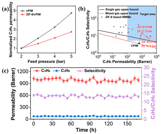 (a) The relationship between the C3H6 permeability and feed pressure for cPIM and ZIF-8/cPIM membranes. (b) Comparison of C3H6/C3H8 separation performance with other classes of membranes reported in the literature. Red star: separation performance of 30 wt% ZIF-8/cPIM membrane at 25 °C and 2 bar. Filled and half-filled red star: separation performance of 30 wt% ZIF-8/cPIM membrane at 55 °C and 5 bar. Grey squares: separation performance of ZIF-8-based MMMs reported in the literature. The inset blue area presents the desired performance for industrial C3H6/C3H8 separation. The lines are C3H6/C3H8 single-gas (black) and mixed-gas (red) upper bound, respectively [17,45]. (c) Long-term stability of 30 wt % ZIF-8/cPIM membrane at 2 bar and 25 °C.