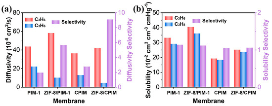 In order to better understand the impact of the interfacial coordination between ZIF-8 and cPIM on C3H6/C3H8 separation, a solution–diffusion model was employed [46]. The diffusivity and solubility coefficient (Figure 7 and Table S4) of C3H6 and C3H8 for cPIM, PIM-1, and regular MMMs with 20 wt% ZIF-8 loadings were tested using a permeameter. It is evident that the incorporation of ZIF-8 led to an increase in the diffusivity and solubility of the gas to some extent. This can be attributed to the doping of the porous ZIF-8 filler, which increases the gas transport channels within the membranes and the free volume fraction of the membranes [24]. Furthermore, both MMMs exhibited a more pronounced enhancement in the selectivity of the diffusivity of C3H6/C3H8, while the selectivity of their solubility remained almost unchanged. This phenomenon was attributed to the molecular sieving effect of ZIF-8 toward C3H6/C3H8 [20]. In particular, the diffusion selectivity (9.11) and enhancement (228%) of the ZIF-8/cPIM membrane toward C3H6/C3H8 were higher than those of ZIF-8/PIM-1 (5.67 and 189%), which was explained by the good compatibility brought about by the interfacial coordination between cPIM and ZIF-8. Additionally, we compared mixed-matrix membranes (MMMs) that did not experience the ZIF-8-polymer interface compatibility enhancement, as shown in Table S5. For the ZIF-8/6FDA-DAM, ZIF-8/XLPEO, and ZIF-8/PIM-6FDA-OH membranes, the improvements in C3H6/C3H8 selectivity were 150%, 170%, and 48%, respectively, all of which are lower than the 290% improvement noted in the ZIF-8/cPIM membrane. This clearly demonstrates that the strong interface compatibility between ZIF-8 and the polymer significantly boosted its sieving performance. When ZIF-8 exhibits good compatibility with the polymer, it can reduce the non-selective pathways for C3H8 passing through the interfacial gaps, leading to a decrease in the diffusion coefficient of C3H8 and thereby enhancing the molecular sieving effect [22,39,43]. Therefore, the excellent compatibility between ZIF-8 and cPIM reduced the transport path of C3H8 across the interfacial gap, thus enhancing the sieving effect of ZIF-8 on C3H6/C3H8 within the membrane.