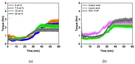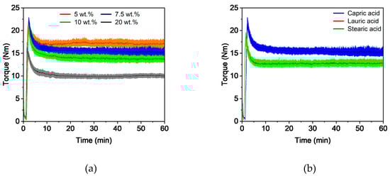 In general, the compounding curve can be divided into three phases: the filling phase, mixing phase, and equilibrium phase []. Figure 1a shows the torque curves for four different capric acid contents. The overall compounding behavior was the same for all additive proportions and this corresponded to the already described theory. A short mixing phase was followed by a long equilibrium phase of approximately 50 min with an almost constant torque, which indicates a homogeneous feedstock []. As expected, the torque decreased with increasing additive content. This is due to the short chain length of the additive, which lowers entanglement between the polymer chains. It also acts as a lubricant between the polymer chains, reducing inner friction and allowing the chains to glide. Besides the additive content, the additive type also has an influence on the compounding curve (Figure 1b). While feedstocks with lauric acid and stearic acid exhibited nearly the same behavior, the addition of capric acid increased the torque slightly.