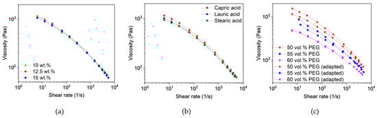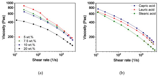 To assess and compare the feedstocks, knowledge about the rheological behavior as a function of the composition is crucial. Due to the shear-thinning behavior of the filled polymers, the viscosity is dependent on the shear rate. According to Beran et al. [], the shear rate in the nozzle can be calculated and is influenced by the layer height, the printing speed, and the inner diameter of the nozzle. The selected printing parameters (layer height 0.1 mm, printing speed 8 mm/s, and inner nozzle diameter 0.4 mm) resulted in a shear rate of 40 s−1. In comparison to other shaping methods like injection molding, this value is comparatively small. Figure 2a shows the shear rate-dependent viscosities of the feedstocks with different capric acid contents. As observed during the compounding process, the viscosity dropped with increasing additive content due to less entanglement and the effect of a lubricant. Differences in viscosity between the three additives were small but can be seen in Figure 2b. Furthermore, a slight separation of PEG and PVB could be observed in feedstocks with less than 10 wt.% capric acid and lauric acid as well as in all feedstocks with stearic acid.