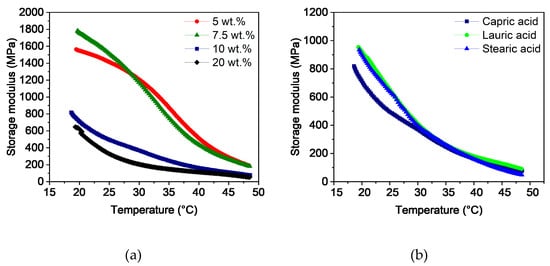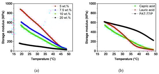 Temperature sweeps of PVB/PEG-based binder with different compositions: (a) variation of capric acid content and (b) variation of the fatty acids with 10 wt.% plasticizers.