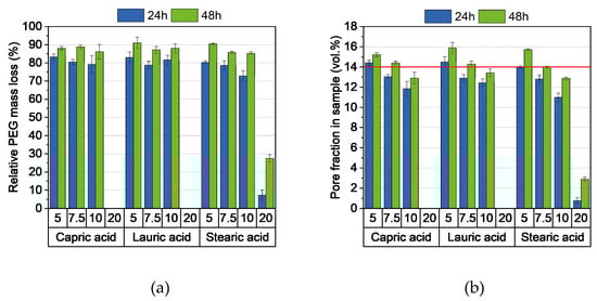 (a) Relative PEG mass loss and (b) pore fraction in samples after 24 and 48 h debinding in water at 20 °C. 14 vol.%. Pore fraction is a strong first indicator of whether a sample can be thermally debinded and sintered without defects.
