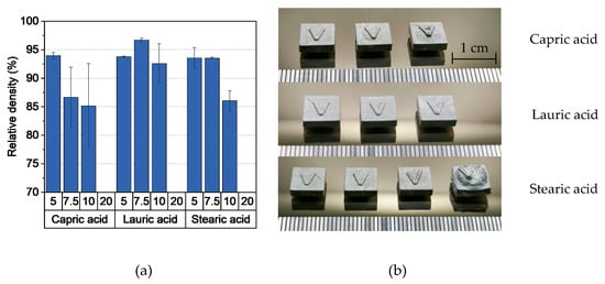 After solvent debinding, the printed parts were thermally debinded followed by a sintering step. Figure 6a shows the achieved relative density values depending on the additive content. For the samples containing 5 wt.% additive, a consistent theoretical density of around 93.5% can be observed. With 7.5 wt.% additive content, the density varies significantly between the different additives. This is possibly due to two countervailing effects: on the one hand, the additional additive content lowers the viscosity of the feedstock, which leads to a better filling of the voids between the extruded lines. On the other hand, a higher additive content results in lower porosity, which can prevent defect-free thermal debinding. With 10 wt.% and higher additive content, defects, in particular, blistering, were observed for every sample (Figure 6b). No density could be measured for samples of the feedstock with 20 wt.% stearic acid, as the samples stuck firmly to the sintering base, which would have falsified the density measurement significantly.