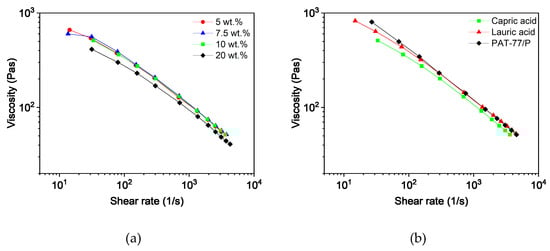 Capillary rheology of PMMA/PEG-based binder at 160 °C with different compositions: (a) variation of capric acid content, and (b) variation of the fatty acids with 10 wt.% plasticizer.