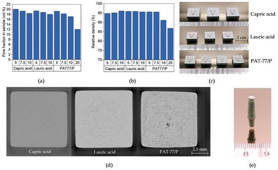 Due to the high content of PEG in the feedstocks, the samples showed a high pore proportion of 18 to 20 vol.% after solvent debinding (Figure 10a). As expected, this fraction decreased with increasing non-water-soluble additive content. For parts containing 20 wt.% PAT-77/P, this value decreased to 12 vol.%. This is the result of the low PEG content combined with the high amount of non-water-soluble additive PAT-77/P, which acts as a barrier and reduces the diffusion of the PEG molecules. However, in contrast to the PVB-based feedstocks, no deformation was observed, which is likely due to the high water resistance of PMMA. The consequences of the low debinding degree can be observed in Figure 10b and 10c; the low pore fraction led to the formation of pores in the samples, which reduced the density significantly. Surprisingly, the samples containing 10 wt.% PAT-77/P also showed a decreased relative density, although no defects could be observed on the surface. However, as can be seen in Figure 10d, a lot of pores can be observed in the sample. This is the result of the high decomposition temperature of PAT-77/P, which is in the same range as the PMMA used. In contrast to the fatty acids, which combust at lower temperatures and therefore create pores in the sample, too much gas was released which led to the formation of small blisters in the sample. The relative densities of the other feedstocks showed similar behaviors and were in the range of 95.5 and 96.1%. Nevertheless, the implant in Figure 10e validates the ability of the PMMA-based feedstocks to manufacture parts with a high level of detail.