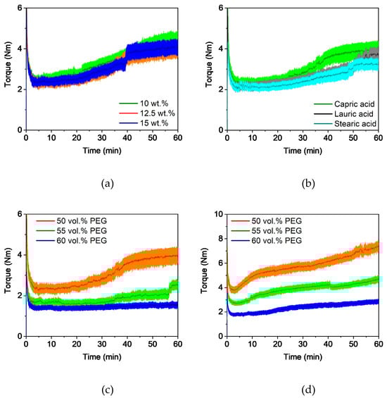 Compounding of PMMA/PVB/PEG-based binder (160 °C) with different compositions; (a) capric acid, (b) comparison with 12.5 wt.% additive, (c) capric acid (12.5 wt.%) with different PEG contents, and (d) capric acid (12.5 wt.%) with different PEG contents at a rotational speed of 60 1/s and smaller PMMA granules.