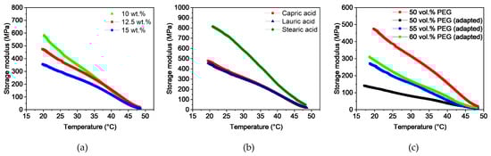 In contrast to the shear viscosity, the additive content (Figure 13a) as well as the additive type (Figure 13b) have a significant influence on the flexibility of the filaments. The higher the additive content, the lower is the storage modulus in the relevant temperature range of 20 to 25 °C. While filaments with 10 wt.% capric acid content have sufficient flexibility, filaments with 12.5 and 15 wt.% guarantee better handling. The same behavior can be observed for lauric acid. On the contrary, filaments with stearic acid show a brittle behavior, which is likely due to the longer stearic acid molecules and thus, less chain movement. Two interesting characteristics could be observed for the adapted feedstock compositions with capric acid (Figure 13c). They showed considerably lower storage modulus values. This can be seen for the feedstock with 50 vol.% PEG, where the storage modulus for the adapted feedstock at 25 °C is 300 MPa lower than that of its counterpart. The two inhomogeneous feedstocks with the PMMA granulate residues were not measured. The reason for this behavior is due to the higher shear rate and the smaller PMMA granules, which results in more intensive and faster blending of the additive and the polymer chains. On the other hand, the increase of PEG has a negative impact on the flexibility of the filaments. This leads to the conclusion that only the backbone polymers interact with the additives.