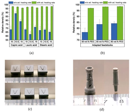 (a) Relative density of the samples after sintering without and with the adapted (ad.) heating rate of 0.2 K/min until 250 °C is reached, (b) relative density of the samples made from the adapted feedstocks after sintering without and with the adapted heating rate of 0.2 K/min until 250 °C, (c) difference of the sintered samples without (upper picture) and with (bottom picture) the adapted heating rate, and (d) printed and sintered chess rook and dental implant.