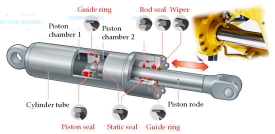 Hydraulic cylinders represent such an example, as the most frequently used very statically and dynamically loaded hydraulic component, wherein a whole set of seals is installed for the following: for internal and external sealing of the piston and piston rod, for wiping the impurities from the piston rod, and for guiding and keeping the piston rod in the appropriate position (guide rings). Therefore, the problem of seals in hydraulic cylinders is the subject of many different studies (e.g., [18,19,20,21,22]). Also, the shapes of the seals themselves and the materials used for the seals are very different, depending on the intended use of the cylinder and the load. Figure 1 shows the different types, shapes, and locations of seals in the case of a conventional hydraulic cylinder, as represented by several specialist suppliers of hydraulic seal sets (e.g., [23,24,25,26]).