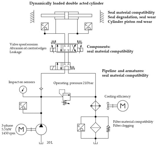 Test device for long-term testing of the impact of new hydraulic fluids on system components and overall system behavior with points of interest [47].