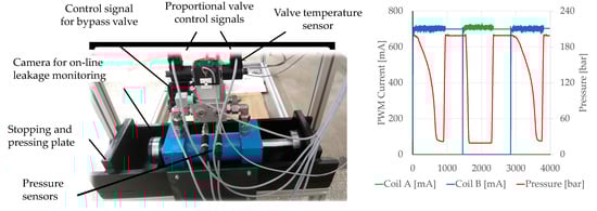 The proportional valve control signal change causes a change in operational pressure, which varies between 5 bar and 210 bar, with a total period of two changes in 2.8 s. The pulse variation in the pump pressure at a frequency of approximately 1 Hz is achieved in this way. All the built-in seals were also dynamically and cyclically loaded in this way.
