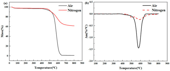 - The thermal degradation performance of PMR350 under various atmospheres was investigated using TGA. The results indicated that PMR350 exhibited a higher Td5% in a nitrogen atmosphere, which was 29 °C higher than that in air. Additionally, PMR350 demonstrated improved residual weight and a lower thermal degradation rate, suggesting that oxygen accelerated and promoted thermal degradation.