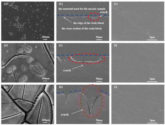 PMR350 resin: (a) 100 h surface; (b) 100 h section edge position; (c) 100 h section center position; (d) 200 h surface; (e) 200 h section edge position; (f) 200 h section center position; (g) 300 h surface; (h) 300 h section edge position; (i) 300 h SEM image of central position of section.