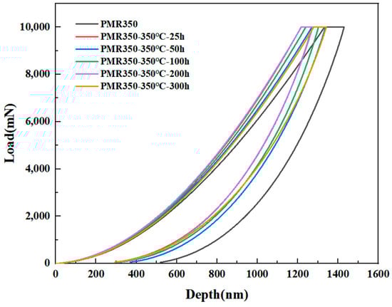 Nanoindentation curves of PMR350 resin before and after thermal assessment.