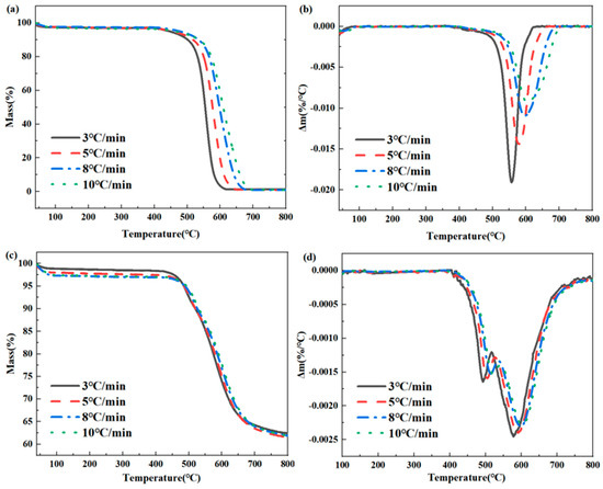 (1) TGA analysis: The STA499 F3 thermal analyzer by Netzsch (Waldkraiburg, Germany) was utilized in both nitrogen and air atmospheres. The test temperature ranged from room temperature to 800 °C, with heating rates of 3, 5, 8, and 10 °C/min. This was performed to examine the TGA curve of PMR350 polyimide resin under various heating rates.