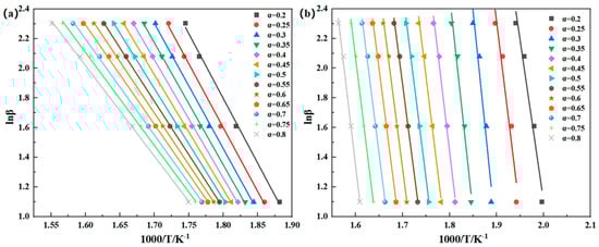 Linear fit of the lnβ − 1000/T curve in (a) air and (b) nitrogen based on the Flynn–Wall–Ozawa method.