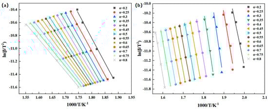 ln(β/T2) − 1000/T linear fitting curve in (a) air and (b) nitrogen based on the Kissinger–Akahira–Sunose method.