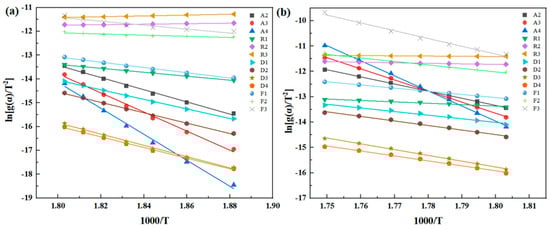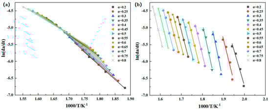 ln(βdα/dT) − 1000/T linear fitting curve in (a) air and (b) nitrogen based on the Friedman method.