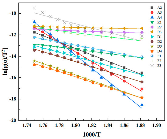 To infer the thermal degradation mechanism of resin, researchers often employ the Coats–Redfern method to establish a linear relationship by utilizing characteristic values at different conversion rates (α) to calculate the activation energy. The Coats–Redfern method is typically applied using a simplified formula, as shown in Equation (6). Depending on the various degradation processes, the corresponding theoretical function g(α) is presented in Table 8 [26]. The activation energy (Ea) can be determined from the slope of the ln[g(α)/T²] − 1/T diagram. The activation energies of the different degradation processes are then compared with the results in Section 3.3 to elucidate the reaction mechanism.