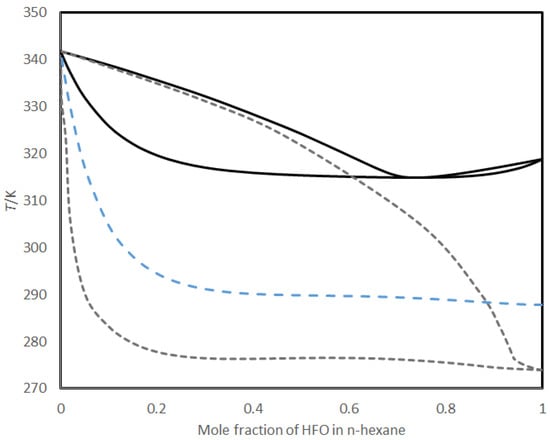T-x-y diagram for HFO-1336mzz (Z) with n-hexane (black solid lines) and HFO-1336mzz (E) with n-hexane (graydashed lines) and bubble point curve for a 50:50 mixture (mol basis) of HFO-1336mzz (Z) and HFO-1336mzz (E) with n-hexane (blue dashed line).