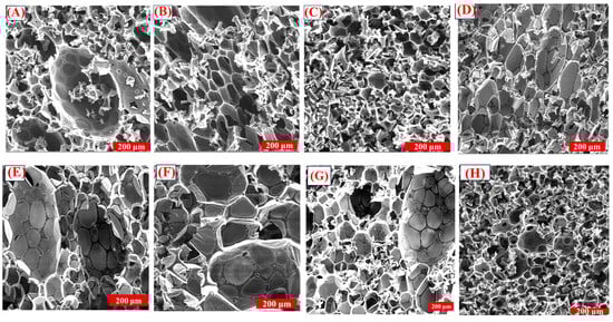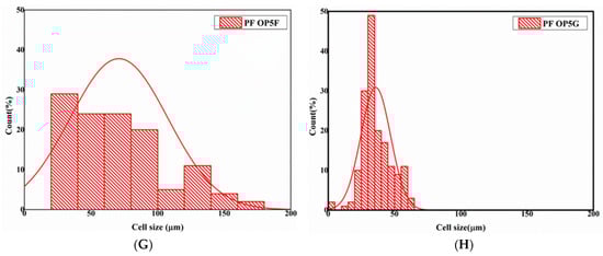 Cell size distribution of the foams formulated by changing the concentration of Agnique CSO 30 and PEG. (A) PF OP5, (B) PF OP5A, (C) PF OP5B, (D) PF OP5C, (E) PF OP5D, (F) PF OP5E, (G) PF OP5F, and (H) PF OP5G.
