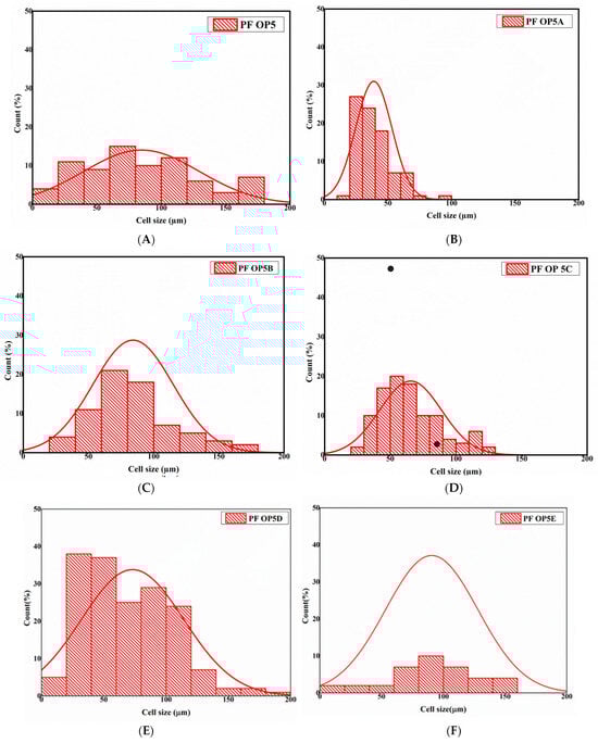 In formulations PF OP5, PF OP5A, and PF OP5B, the density increases with an increase in the surfactant concentration. Each of these foams shows a density-dependent cell size variation. The mean cell size of all three foams decreases as the density increases. PF OP5 had cell diameters ranging from 3 μm to 172 μm, with a mean cell size of 85 ± 14 μm. In PF OP5A, the cells became smaller, with a mean cell size of 66 ± 23 μm, whereas in PF OP5B, the cell size decreased further to 49 ± 14 μm. The cell size distribution of the foams is shown in Figure 7. The foam PF OP5C formulated without PEG contains elongated cells with a mean cell size of 65 ± 29 μm. The slight increase in compressive strength is attributed to the presence of small cells. With an increase in the surfactant concentration, the resin’s surface tension and viscosity will be reduced, resulting in efficient mixing of the reagents and better cross-linking within the resin structure. An appropriate surfactant concentration will offer much more stability to the blowing agents by ensuring a fine emulsion which aids their even distribution and expansion in a controlled manner during the foaming process. As a result, the cell structure becomes more uniform with smaller cells. In the formulations from PF OP5D to PF OP5E, the addition of PEG makes the foam expansion easier at lower concentrations, which leads to a decrease in density, facilitated by the expansion of the cells. With the addition of 2% PEG and 4% PEG, the mean cell size increases to 73 ± 40 μm and 93 ± 33 μm, respectively. After the optimum concentration, further addition of PEG leads to a more compact structure, resulting in an increase in density and a decrease in the mean cell size. The foams with 6.8% PEG show a mean cell size of 36 ± 10 μm, further confirming the toughening ability of PEG and the high compressive strength of the corresponding foams.