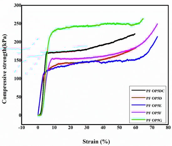 The foam PF OP5 was formulated with 8.4% (w/w) surfactant and exhibited a density of 60 ± 3 kg/m3 and a compressive strength of 172 ± 6 kPa. The compressive strength of the foam is directly proportional to its density [56]. The increase in the compressive strength of PF OP5A and PF OP5B is due to the corresponding increase in their foam density. The small cells also contribute to the increase in the compressive strength of the foam. Like density, the compressive strength of the foams also decreases initially and then shows an increase with PEG concentration. Apart from their density, the addition of toughening agents to the foams can also influence their compressive strength. Toughening agents impart toughness by introducing flexibility into the resin structure. Adding PEG to the foam causes increased strength via the formation of ether linkages with the resin’s OH groups. Thus, the flexibility introduced by the long flexible resin–CH2–O–CH2–PEG chains into the resin’s structure provides a proper distribution of the blowing agents, surfactants, and catalysts in the resin matrix during foam formation, thereby toughening the phenolic foam and improving its mechanical strength.