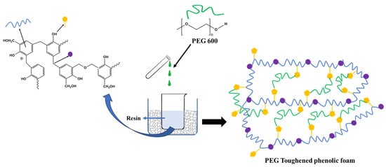 In the formulations PF OP5F and PF OP5G, the PEG concentration was 6.4% and 6.8%, respectively. Density and compressive strength were observed to increase compared to the formulations with low PEG concentrations. The formulation PF OP5G, prepared with a total surfactant concentration of 12.8%, shows the lowest density, along with a high mechanical strength. This formulation provides good stability to the blowing agent emulsion in the resin and aids expansion in a controlled manner, resulting in a foam with a small and uniform cell structure. The cell size distribution becomes narrow with a mean cell size of 36 ± 10 μm. The uniform and small cells resulted in a very high compressive strength of 231 ± 7 kPa. The combined stabilization and toughening effect of PEG facilitates lowering the cell size and a uniform distribution of the blowing agents in PF OP5G. The toughening mechanism of PEG is shown in Figure 9. At a PEG concentration of 6.8%, the hydroxyl groups present in the PEG react with the –CH2OH functional groups in the resin, and long chains of PEG are introduced into the resin matrix, which gives higher flexibility under the applied stress. If the PEG concentration is increased further beyond 6.8% by weight, mixing becomes difficult due to agglomeration.