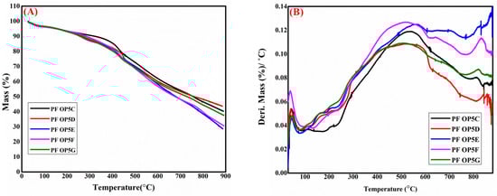 TGA (A) and DTG (B) graphs of phenolic foams formulated by changing the concentration of PEG.