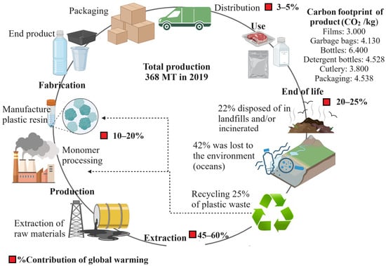 There are several methods for eliminating conventional plastic wastes; the main alternative is to reuse and recycle them. Plastic recycling can be addressed by mechanical processing, chemical recycling, and energy recovery. Mechanical recycling allows plastic waste to be used as raw materials for other types of plastic products. Chemical recycling uses various chemicals to decompose plastic waste. This type of recycling involves the depolymerization of the constituent monomers through hydrolysis, alcoholysis, glycolysis, ammonolysis, pyrolysis, hydrogenation, and gasification [3]. The third alternative involves incineration to produce energy by burning plastics, which also produces extensive amounts of carbon dioxide, affecting the environment [6]. Furthermore, it should be considered that plastics can only be recycled to a limited degree because they lose various properties that affect their structure [6]. Figure 1 shows the processing stages of plastic, and its final disposal. Note that in 2018, it was estimated that 25% was recycled, 22% was disposed of in landfills or incinerated, and 42% was lost in the environment, for example, in the ocean or uncontrolled landfills [3]. As a measurement of the environmental impact of conventional plastics, their contribution to global warming can be considered. In this case, crude oil extraction causes the greatest impact, with greenhouse gas emissions ranging between 45 and 60%. End-of-product management follows at 20–25%, and finally, the manufacturing process accounts for 10–20%. These percentages collectively contribute 50% to the impact of global warming [7].