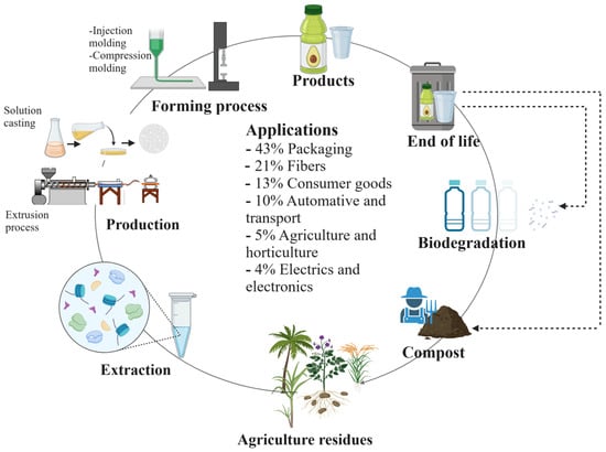 Biodegradable polymers can be classified into four classes: those obtained from biomass and natural resources; polymers produced by microbes through the fermentation of agricultural products; polymers that are polymerized from oligomers or monomers obtained by fermentation; and polymers derived from fossil fuels [68]. In recent years, alternative sources have been sought for producing bioplastics. Materials such as starch, cellulose, wood, sugar, and biomass in general have been investigated as substitutes for fossil fuel resources to produce bioplastics [69,70]. Agricultural waste produces around 933 MT annually worldwide [71]. Agricultural activities, food processing, alcohol, logging, and sugar production industries, among others, produce a large amount of agricultural waste, which is not properly treated and generates pollution. These agricultural wastes have been used as soil fertilizers, in paper manufacturing, and fuel production; most of them are incinerated or distributed in controlled and uncontrolled landfills [72]. However, their use in these activities is minimal, opening up opportunities for integrating them in circular economy processes to fabricate bioplastics. This section describes some of the most used sources for the synthesis of bioplastics, such as polysaccharides (starch, cellulose, chitin, and pectin). Figure 3 illustrates the extraction process of polysaccharides, their processing, application, and disposal at the end of their useful life. At this point, it is worth noting that the source of biomass, the type of plant, the species, and even its age will affect the chemical composition of its constituent polymers, directly influencing the composition of the new bioplastic to be developed [71,73].