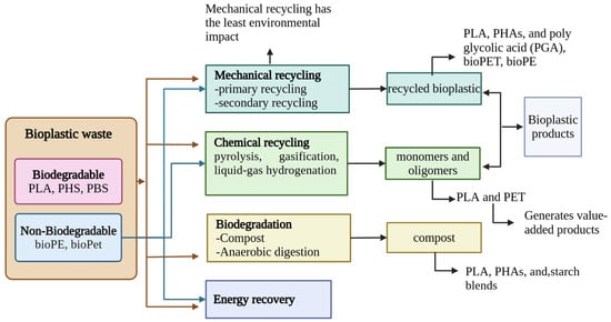 Routes of recycling of bioplastic waste [13,164].
