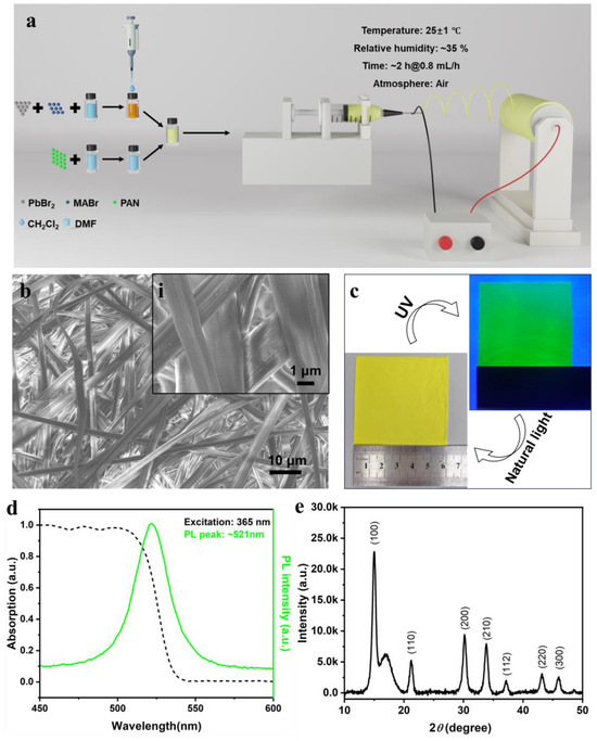 N, N-dimethylformamide (DMF, 99.5%, Aladdin, Shanghai, China), Dichloromethane (DCM, 99.97%, Macklin, Shanghai, China), Lead (II) Bromide (PbBr2, 99.99%, Macklin, Shanghai, China), Methyl ammonium bromide (MABr, MA+ = CH3NH3+, 99.5%, Xi′an p-OLED, Xi′an, China), and polyacrylonitrile (PAN, Mw ≈ 90,000, Aladdin, Shanghai, China) were all used as received without any further purification and were purchased from commercial sources.