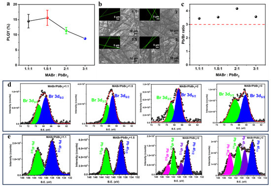 The chemical compositions of fibers with perovskite/PAN compositions. (a) The PLQY’s dependence on the MABr/PbBr2 ratio in the precursor solution. The PLQY of each ratio was tested from 5 samples and the average value was obtained as circle mark to avoid occasionality. (b) Fibrous structures from different precursor solutions with various ratios of MABr/PbBr2. The inserted PL microscope photograph corresponded to each sample. (c) The ratio of Br/Pb in different samples. (d) Br 3d spectra in different samples. (e) Pb 4f spectra in different samples.