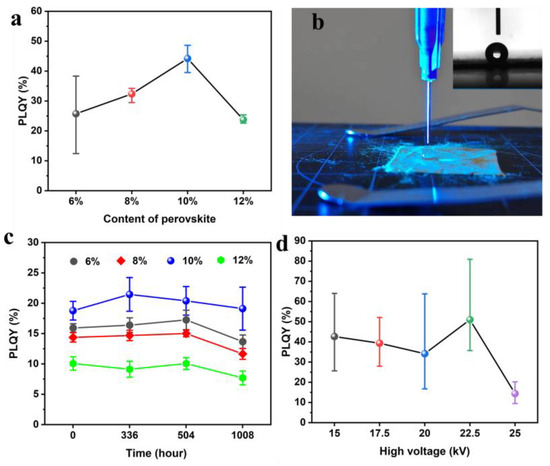 Effects of the perovskite content and process on its properties. (a) The PLQY’s dependence on the perovskite content.Circle in each color represented the average value in statistics from 5 samples. (b) The hydrophobic properties of the QCMs. Inserted image: contact angle testing. (c) The PLQY retention was restored in ambient environment with RH 35% and a room temperature of approximately 25 °C. (d) Analyzing the PLQY in relation to the high voltages applied in electrospinning, for which the highest PLQY reached 80%.Circle in each color represented the average value in statistics from 10 samples.