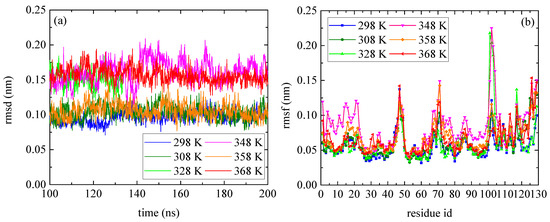 (a) Root mean square deviation (rmsd) and (b) root mean square fluctuation (rmsf) for lysozyme at different Ts (298–368) K from the last 100 ns of the trajectory.
