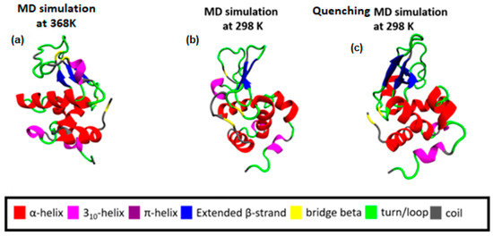 Following a thermal quenching from the highest temperature (368 K) back to room temperature (298 K), the reversibility of any structural changes initially is visualized in Figure 2. A configuration at 368 K (Figure 2a), which constitutes the starting point for the quenching process, the final configuration after the quenching run (298 K) (Figure 2c), and a configuration from a run at 298 K (Figure 2b) are presented. Different colors correspond to different types of secondary structure. For the specific cooling rate, a higher similarity between (a) and (c) snapshots is visually observed, which will be quantified in the following, by a secondary structure analysis. For this analysis, the DSSP algorithm [52] is used, where the characteristic hydrogen bond pattern for each secondary element is utilized as a criterion [53] to identify the hydrogen bonds between the backbone atoms of a protein. DSSP analyzes the secondary structure of the protein and classifies the protein into eight types of secondary structure: coil; β-sheet; β-bridge; bend; turn; α-helix; π-helix; and 310-helix.