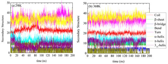 The specific structure of lysozyme, i.e., the number of residues in every specific conformation as a function of time, is presented in Figure 3 for 298 K and 368 K. The DSSP analysis for the individual residues as a function of time is shown in Figure S2. The increase or decrease in the appearance of each type of structure at different temperatures is presented in Table 2. Small conformational changes in the secondary structure of lysozyme are reported indicating a thermostable protein. Secondary structure quantification was performed through averaging over the last 100 ns of the trajectory (“equilibrated structure”).
