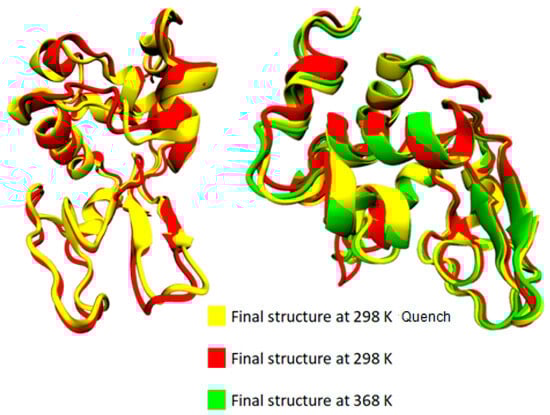 The bottom section of Table 2 summarizes the difference in average values between two temperature extremes: (i) the difference between the lowest (i.e., T = 298 K) and the highest (i.e., T = 368 K) temperatures; (ii) the difference between the starting temperature (368 K) and the final temperature (298 K) after a quenching process (i.e., initial vs. final configuration of the run); and (iii) the difference at 298 K comparing the quenched state with the unquenched state. Although changes are very small and almost within the statistical uncertainties for most of the structures, a rough observation can be reported concerning an almost irreversible change in some structures with temperature increase from 298 K to 368 K and then cooling back to 298 K (i.e., last line of Table 2: coil, 310-helix, π-helix). In Figure 4, the superimposed structures of lysozyme are presented at the three states (368 K; 298 K; and 298 K after quenching), where the small local conformational changes are visualized. However, the overall thermostable character of lysozyme is also illustrated.