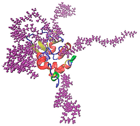 The association of lysozyme and PAA is presented in the characteristic snapshot of Figure 6. The protein molecule is surrounded by polymer chains which are attached on specific sites. All measures in the following are calculated in the “steady state” part of the trajectory (i.e., the last 100 ns of the simulation run).