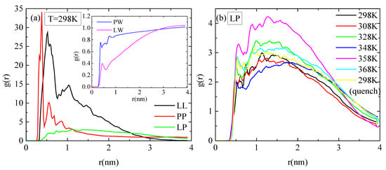 Pair radial distribution functions (rdf), g(r), based on the center of mass of the residues of the protein, of the monomers of the polymer, and of the water molecules, quantify the proximity between the different species in the aqueous solution. The affinity of polymer chains for protein is reduced compared to their self rdfs (i.e., PP, LL), as it is presented in Figure 7a. Moreover, both molecules are hydrophobic, with lysozyme attaining a higher degree of hydrophobicity, as it is observed in the inset of Figure 7a, where rdfs for polymer–water and for protein–water pairs are presented. In Figure 7b, the rdfs between lysozyme and PAA at different temperatures do not show any systematic trend with temperature. In addition, the curves at 298 K with and without quenching are rather close, indicating a similar tendency for association at the two states.
