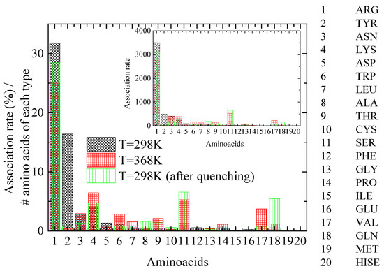 A key question is how lysozyme’s attachment sites for PAA chains are affected by the thermal treatment. For this reason, distances between PAA and lysozyme atoms are calculated and the pair with the minimum distance between protein atoms and all PAA chains’ atoms is established. The specific protein atom is assigned to the corresponding amino acid for each configuration. A further classification is then applied according to a criterion for distances less than 0.35 nm, which corresponds to that which meets the hydrogen bond criterion. Finally, a histogram of the percentage of time of association of lysozyme with PAA, calculated for the amino acids with the shortest approach in polymer chains, is created, ranking the 20 different amino acids that make up lysozyme (association rate). Figure 8 shows histograms at 298 K, 368 K, and 298 K after quenching, where normalization with the number of corresponding amino acid types within the protein molecule and with the number of the configurations of the analyzed trajectory was performed. The inset histograms show the same results where no normalization was applied.