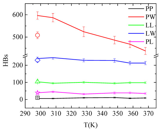An overall picture for the effect of the temperature on the hydrogen bonding in the system is given in Figure 9 and Table S1, where hydrogen bonds between all pairs of molecules in the system are presented (i.e., PAA-PAA (PP); PAA-water (PW); lysozyme-lysozyme (LL); lysozyme-water (LW); and PAA-lysozyme (PL)). The total number of hydrogen bonds formed between polymer and protein are not affected neither by temperature increase nor by quenching. Although these values fluctuate within error bars, conformational rearrangements impose local increase/decrease in hydrogen bonding of specific amino acids with PAA, indicating local structural changes of lysozyme, as discussed above (Figure 8 and Table 4). Comparing the number of hydrogen bonds that water forms with lysozyme and with PAA, higher hydrophobicity of the protein is indicated.