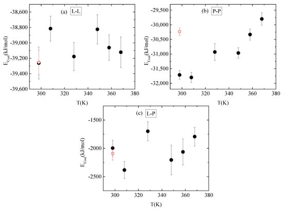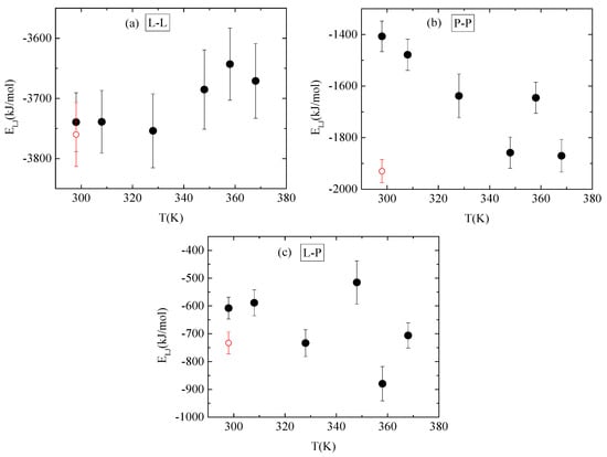 Average electrostatic interactions between (a) lysozyme-lysozyme; (b) PAA-PAA; and (c) lysozyme-PAA as a function of temperature. Red open symbol corresponds to 298 K after quenching.