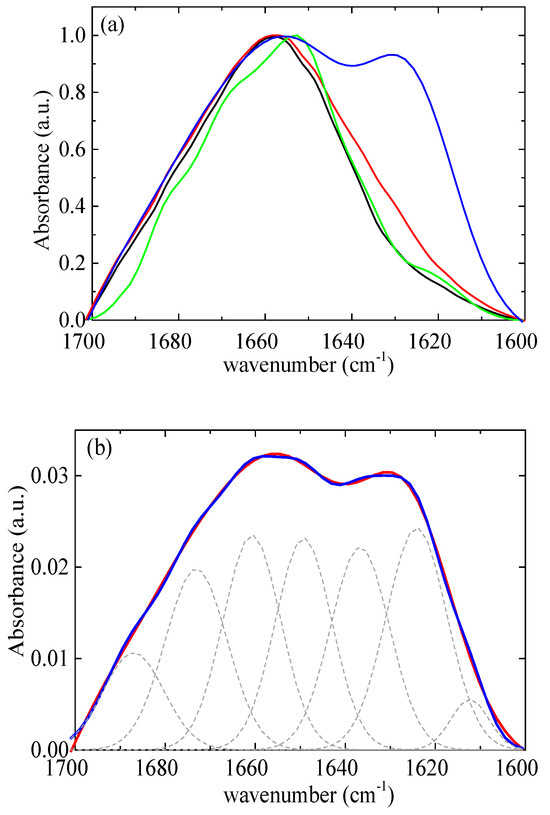 (a) FTIR absorbance spectra from lysozyme at pH 7 (black), at pH 7 thermally treated (red), and from rm = 0.03 at pH 7 (green), at pH 7 thermally treated (blue). (b) FTIR absorbance spectra (red) from complexes at rm = 0.03 after thermal treatment. Best fits are shown in blue and separate contributions in dashed black.