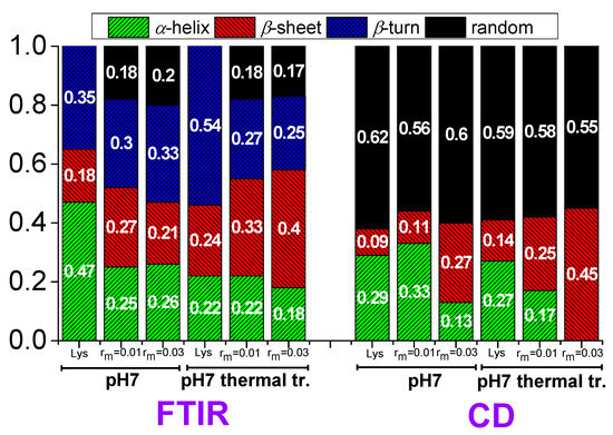 Therefore, the values 47% for α-helix, 18% for β-sheet, and 35% for β-turn (Figure 13) for lysozyme in the free state without thermal treatment are considered reliable as a starting point for investigation in the several conditions of this study.